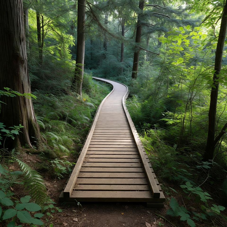 curving path, dense woods, evergreen trees, ferns, forest scenery, forest trail, green canopy, hiking trail, lush forest, moss, nature hike, nature walk, outdoor path, sunlight rays, tall trees, trail walk, wooden bridge, wooden path, woodland path, boardwalk