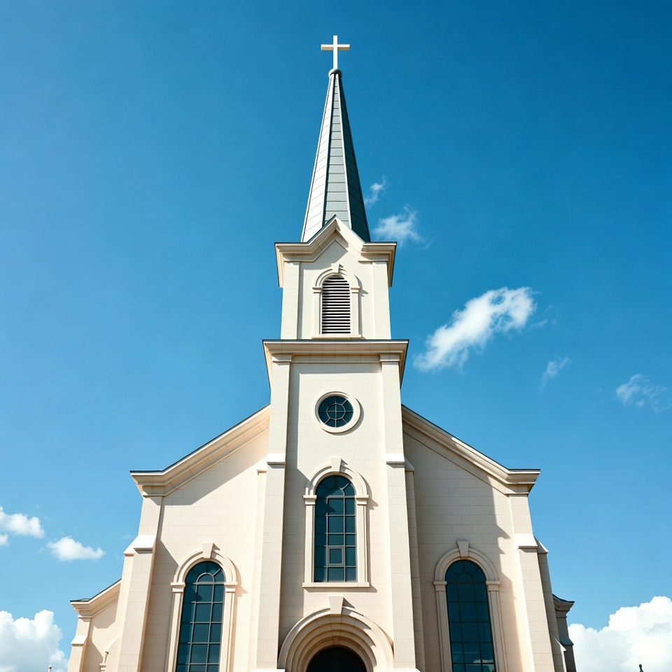 arched windows, architecture, beige siding, blue sky, building, christian, clear sky, clouds, cross, entrance, facade, golden cross, ornate trim, outdoor, religion, round window, shutters, steeple, tall spire, white church, worship place, church