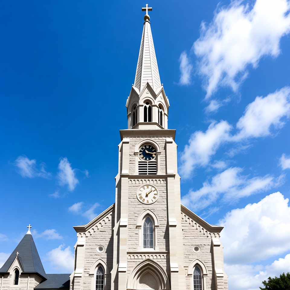 A tall white church steeple with a clock tower rises against a clear blue sky with scattered white clouds. The clock face shows the time clearly on the beige stone facade, featuring arched windows and a cross atop the pointed spire. A smaller adjacent building with a dark roof is visible nearby.