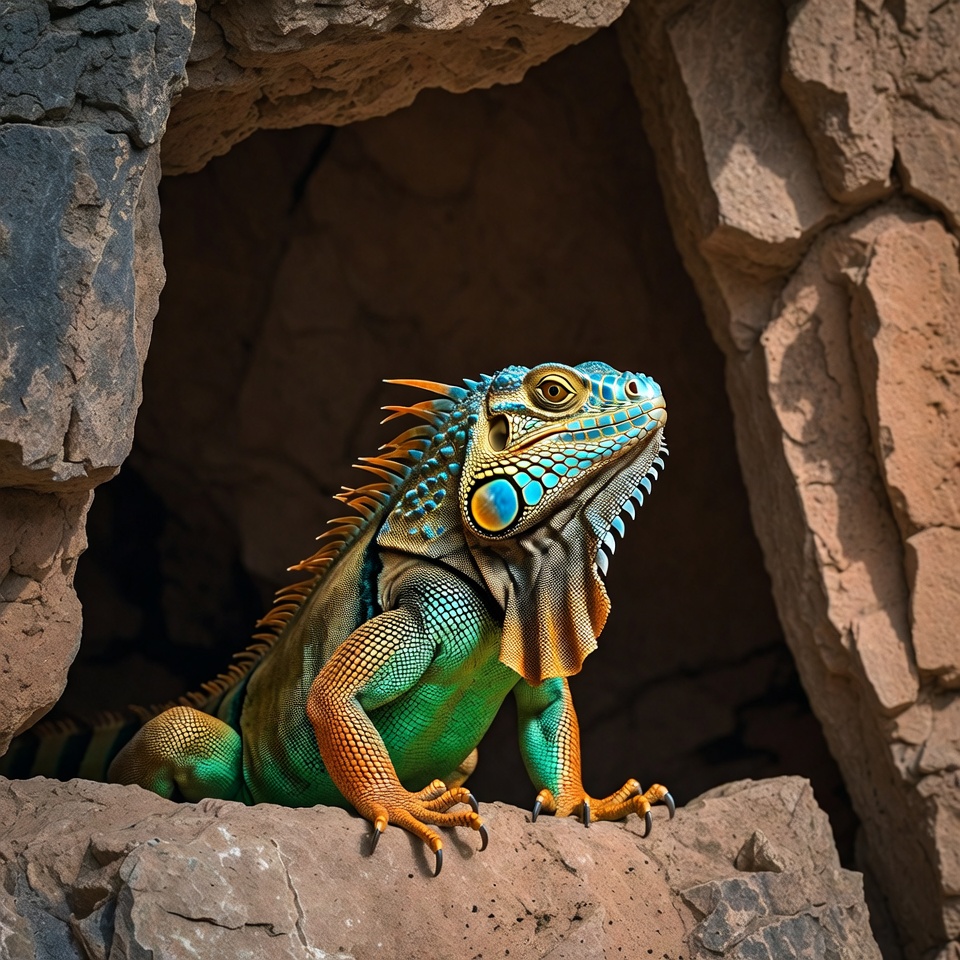 animal, blue eyes, cave entrance, claws, dewlaps, green iguana, isolated background, lizard, orange legs, reptile, rock cave, rocky background, spiny crest, wildlife, iguana