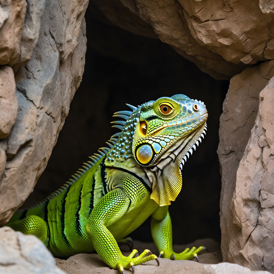 animal, cave, cave entrance, claws, dewlaps, green iguana, isolated background, lizard, red eyes, reptile, rock, scales, spiny crest, wildlife, yellow accents, iguana