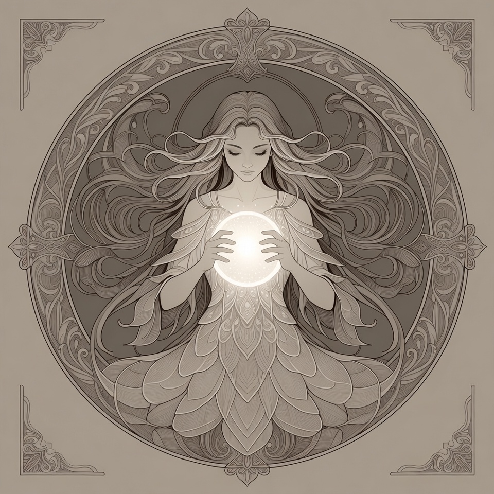 A detailed Art Nouveau illustration features a woman with long flowing hair seated in a circular frame. She wears an elaborate feathered gown and holds a radiant glowing orb in her hands. Intricate floral and vine motifs surround her on a light beige background.