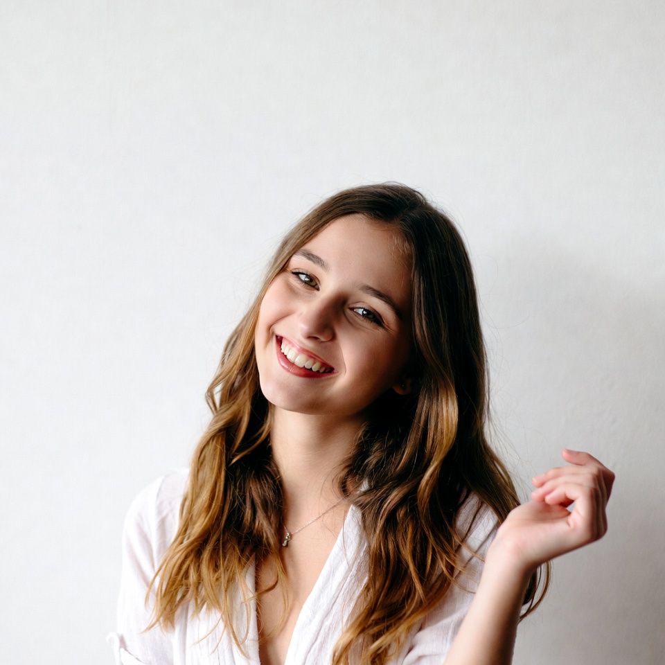 White, beautiful smile, brown hair, casual clothing, female, hand gesture, happy expression, headshot, isolated background, long hair, necklace, portrait, red lips, smiling, studio photo, wavy hair, white background, white blouse, young woman, woman