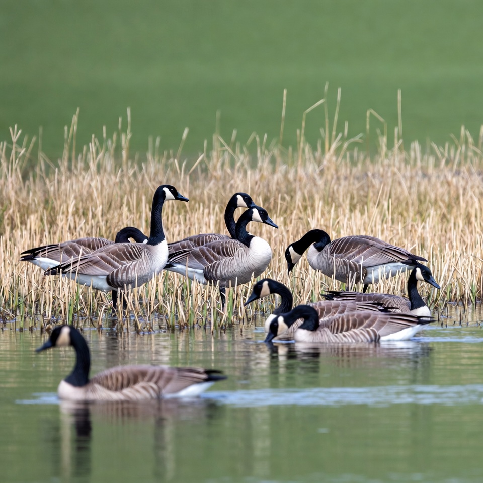 animals, birds, black neck, flock, geese, grass, green field, group of geese, marsh, nature, pond, reeds, shallow water, standing geese, swimming geese, waterfowl, wetland, white face, wildlife, Canada geese