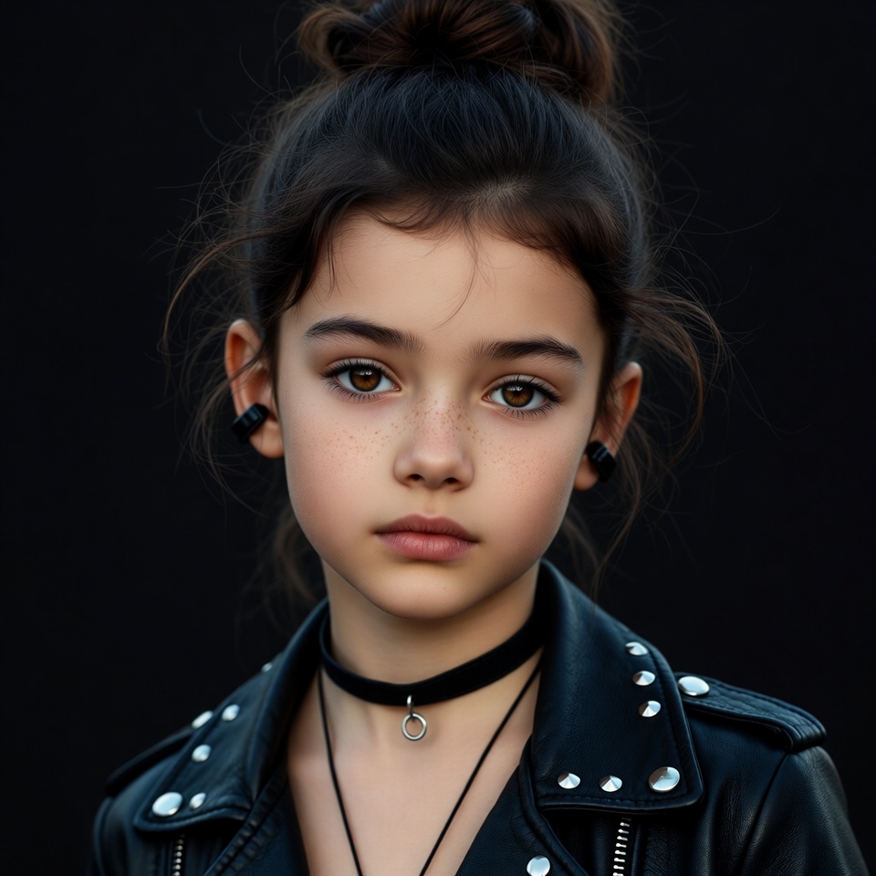 A young girl with dark hair in a messy bun poses against a black background. She wears a black leather jacket with silver studs and a choker necklace, along with black earpieces. Her expression is neutral with freckles visible on her face.