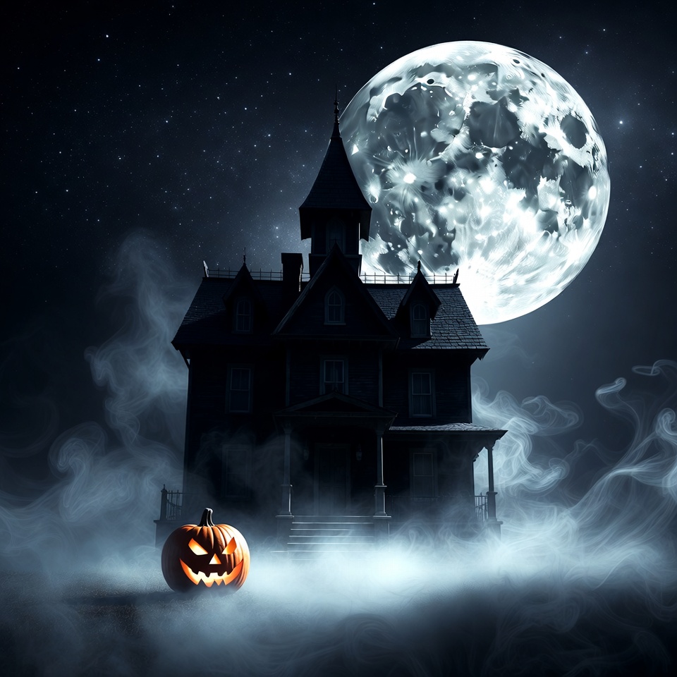 A spooky gothic haunted house stands under a large full moon on a foggy night. A carved jack-o-lantern with glowing eyes sits in the foreground amidst swirling mist. The dark mansion features tall towers, wooden siding, and a porch.