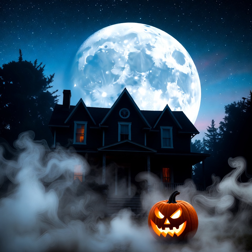 A dark gothic house stands under a large full moon at night, surrounded by foggy trees. A carved jack-o-lantern with glowing eyes sits in the foreground amid swirling mist. Warm light glows from the house windows.