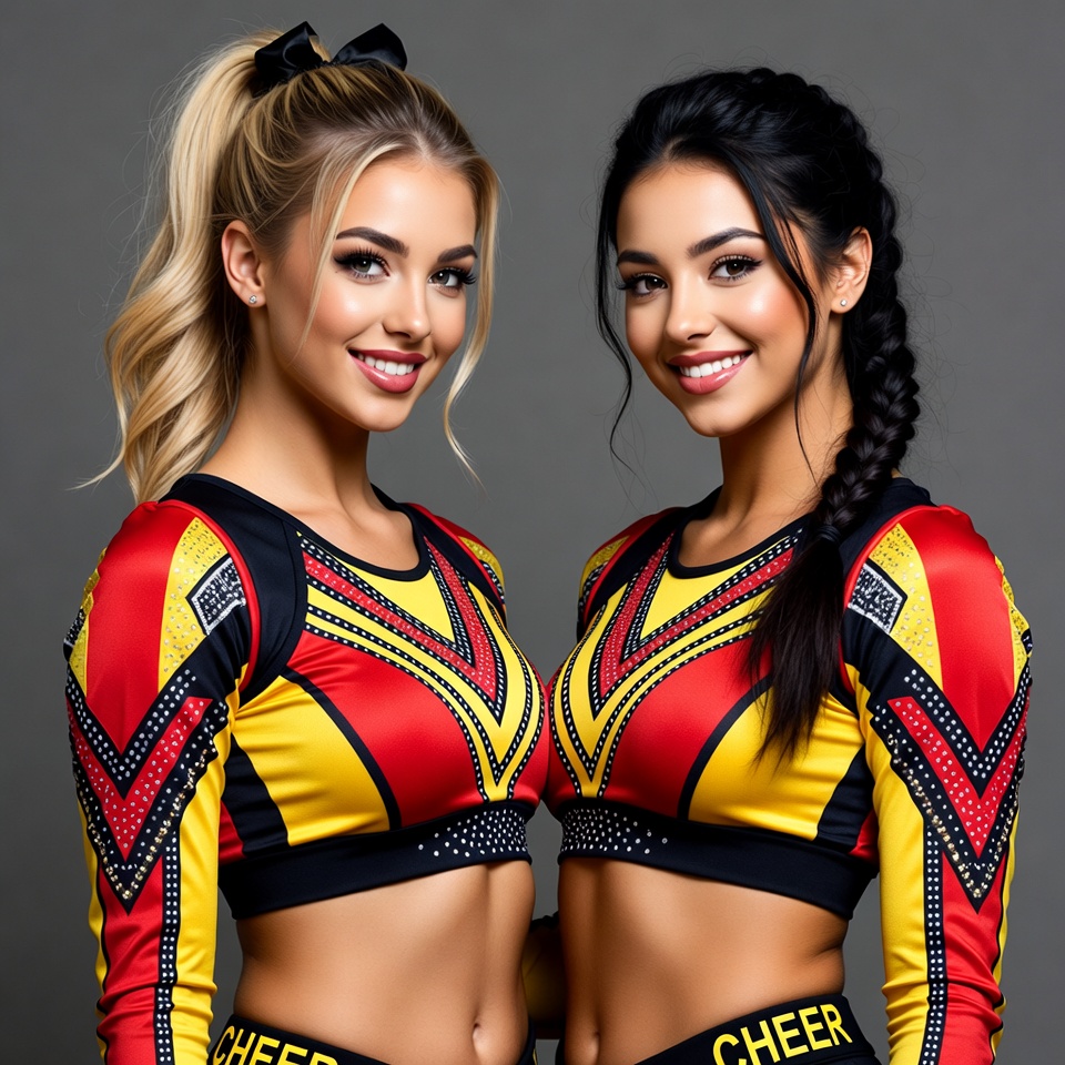 Two young women stand side by side wearing matching cheerleader uniforms with black, red, and yellow colors. The woman on the left has blonde hair in a ponytail, while the one on the right has dark hair in a braid. Both smile at the camera against a gray background.