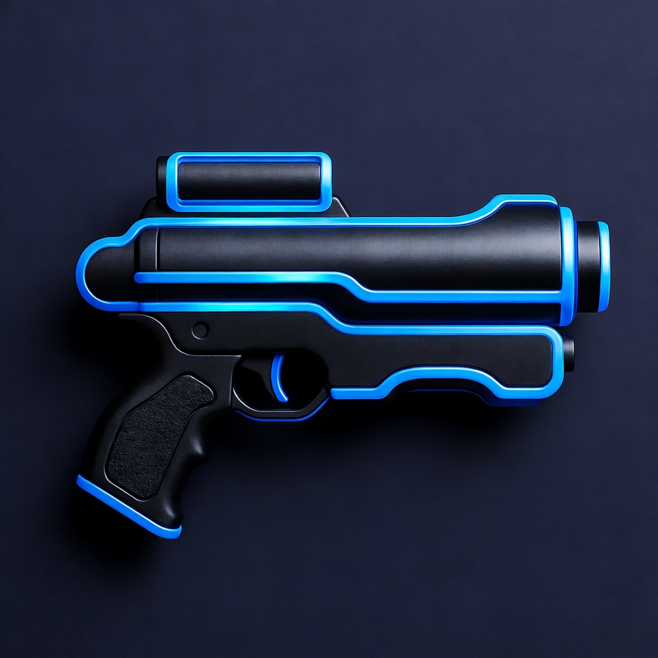 black gun, blaster, blue trim, cyberpunk, dark background, ergonomic grip, futuristic gun, gaming accessory, glowing accents, isolated background, neon blue, pistol, sci-fi weapon, toy gun, weapon, laser gun