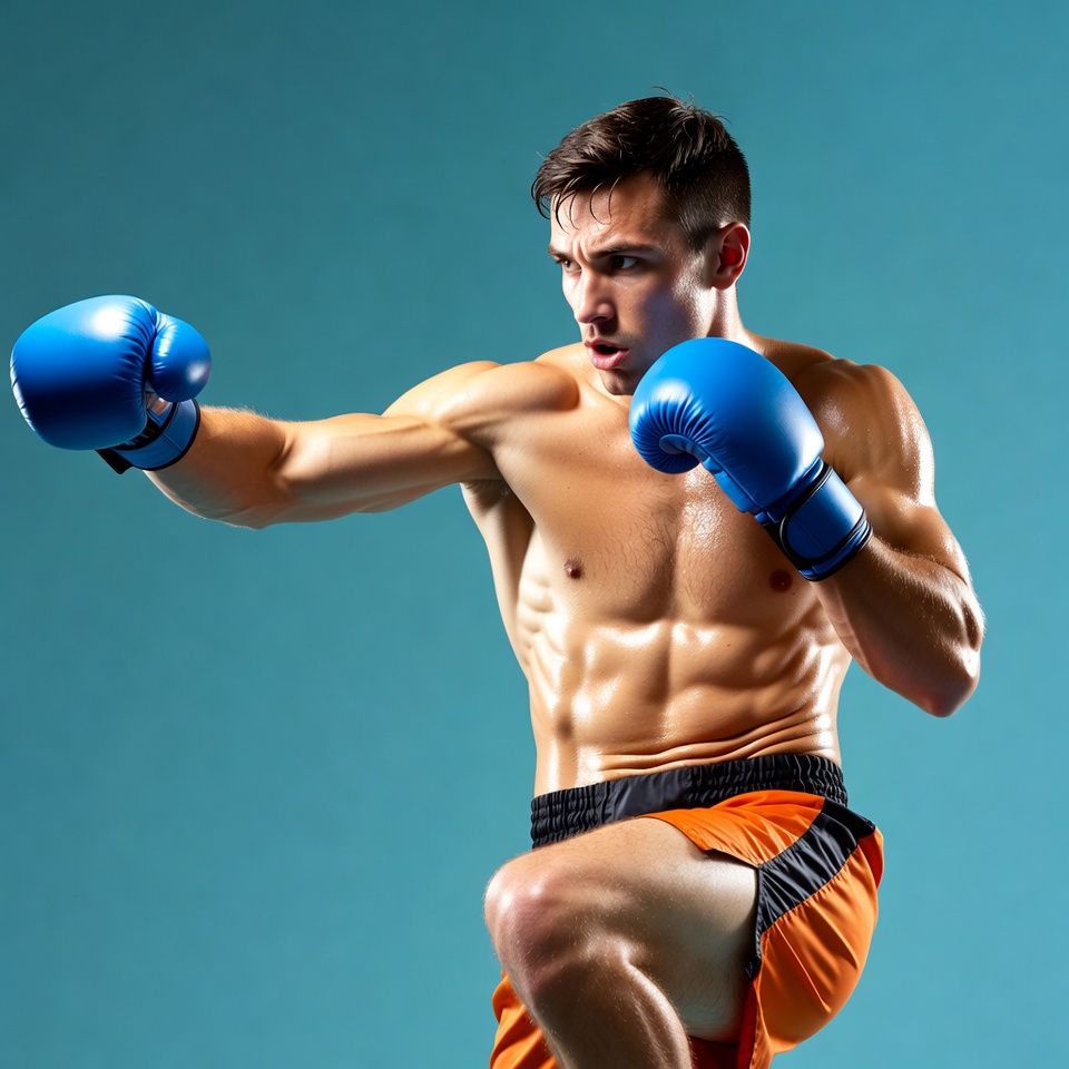 A muscular White man with short dark hair wears blue boxing gloves and orange boxing shorts. He is shirtless, showcasing defined abs and arms, and strikes a dynamic punching pose. The image is set against a solid blue background.