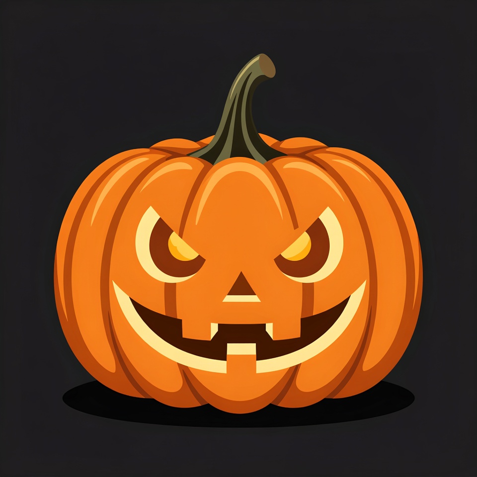 A cartoon jack-o'-lantern pumpkin with glowing yellow eyes and a wide grinning mouth sits on a black background. The orange pumpkin has a green stem and sharp triangular teeth. It features a menacing yet playful Halloween expression.