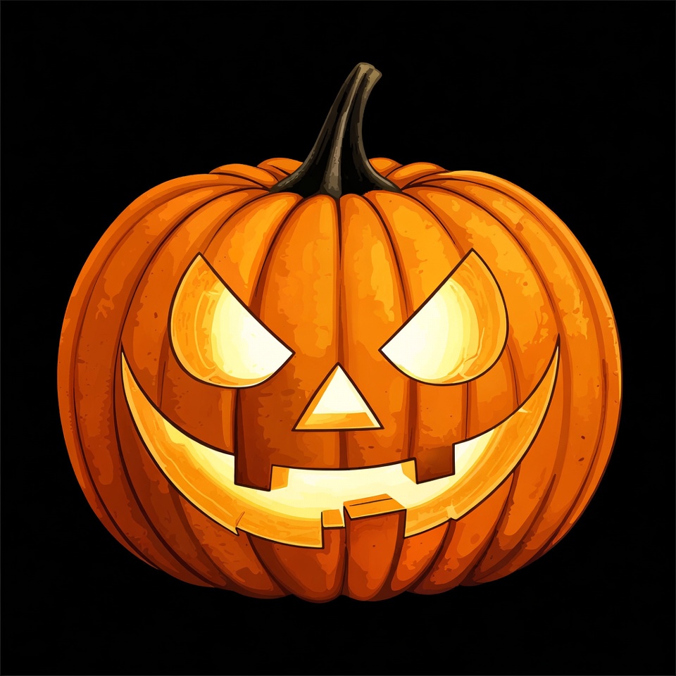 Halloween, black background, cartoon pumpkin, carved face, carved pumpkin, clipart, glowing eyes, green stem, holiday decoration, illustration, isolated background, orange pumpkin, pumpkin, smiling mouth, spooky, triangle nose, yellow glow, jack-o-lantern