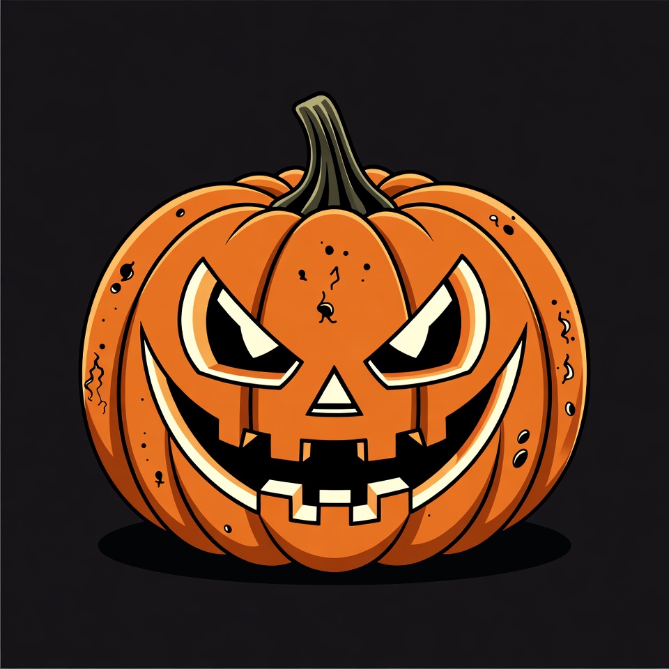A carved orange pumpkin with a menacing jack-o'-lantern face sits on a black background. It features angry slanted eyes, sharp triangular nose, and wide jagged teeth in a sinister smile. The illustration style includes subtle scratches and a sturdy green stem on top.