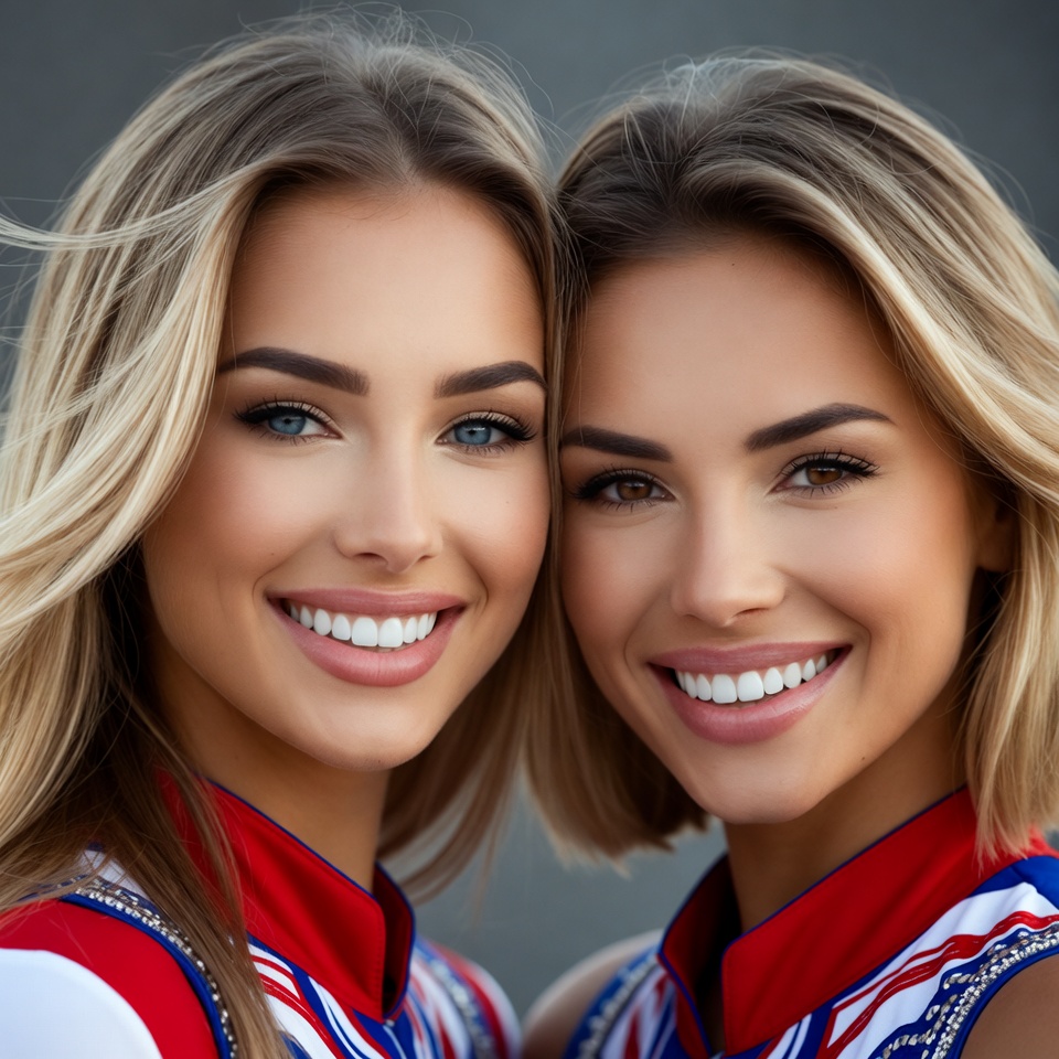 White, blonde hair, blue eyes, cheer uniforms, cheerleaders, close-up, female, glamorous makeup, gray background, portrait, red white blue, smiling, two women, young women, women