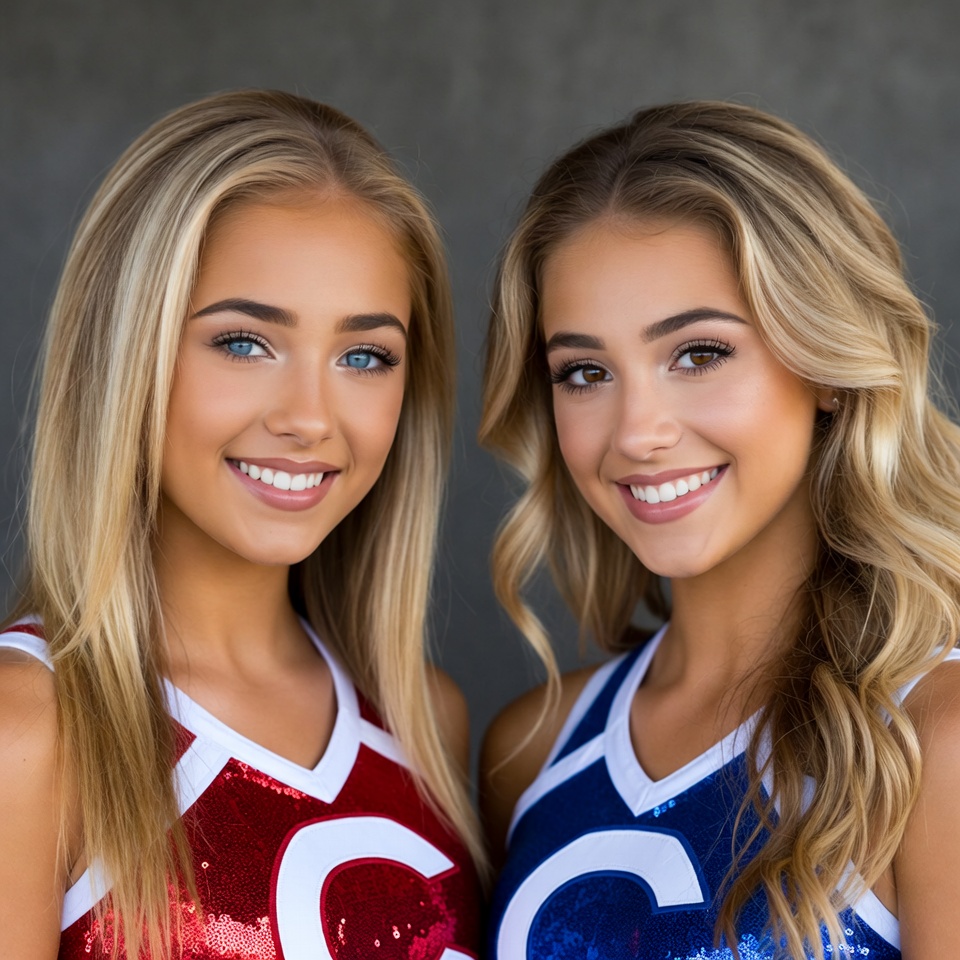 Twin cheerleaders in red blue uniforms