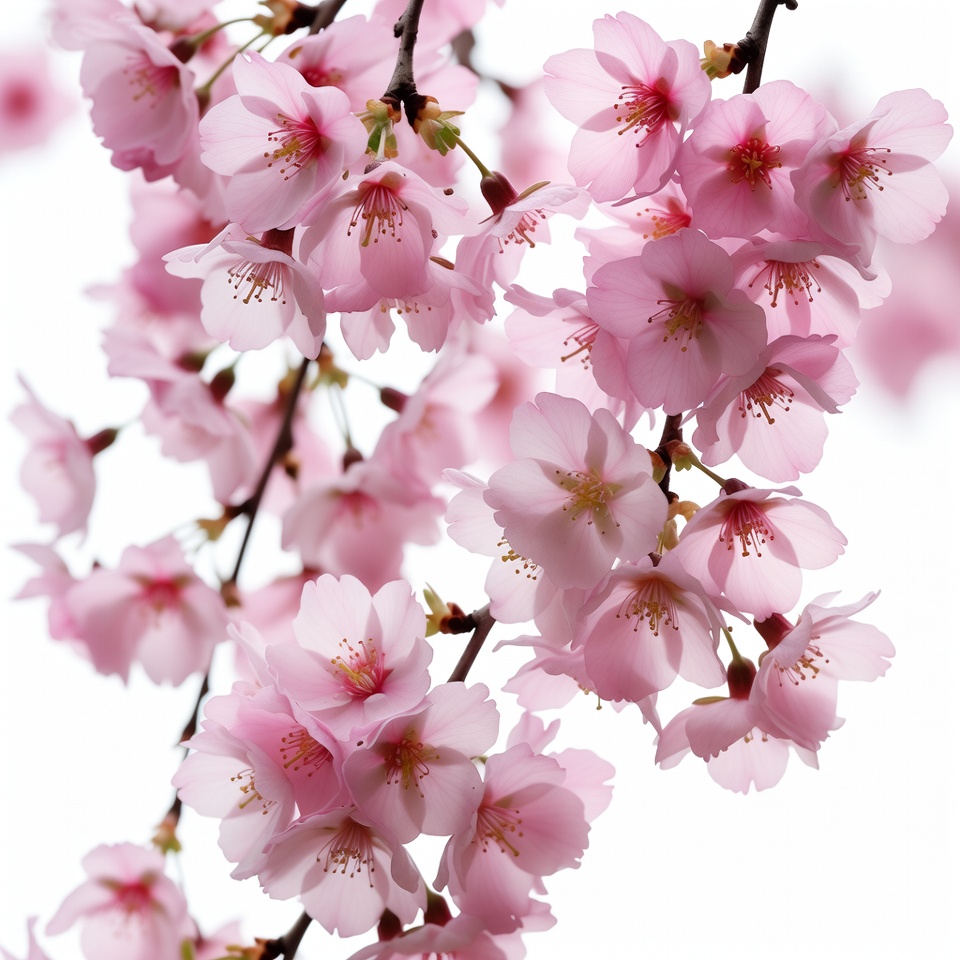 Japanese cherry, blooming flowers, blossom cluster, blossoms, branches, close-up, delicate flowers, flora, floral image, flower branch, flower clusters, flowering branch, macro flower, nature, petals, pink flowers, pink petals, pink sakura, sakura, soft focus, spring flowers, stamens, tree branch, white background, yellow centers, cherry blossoms