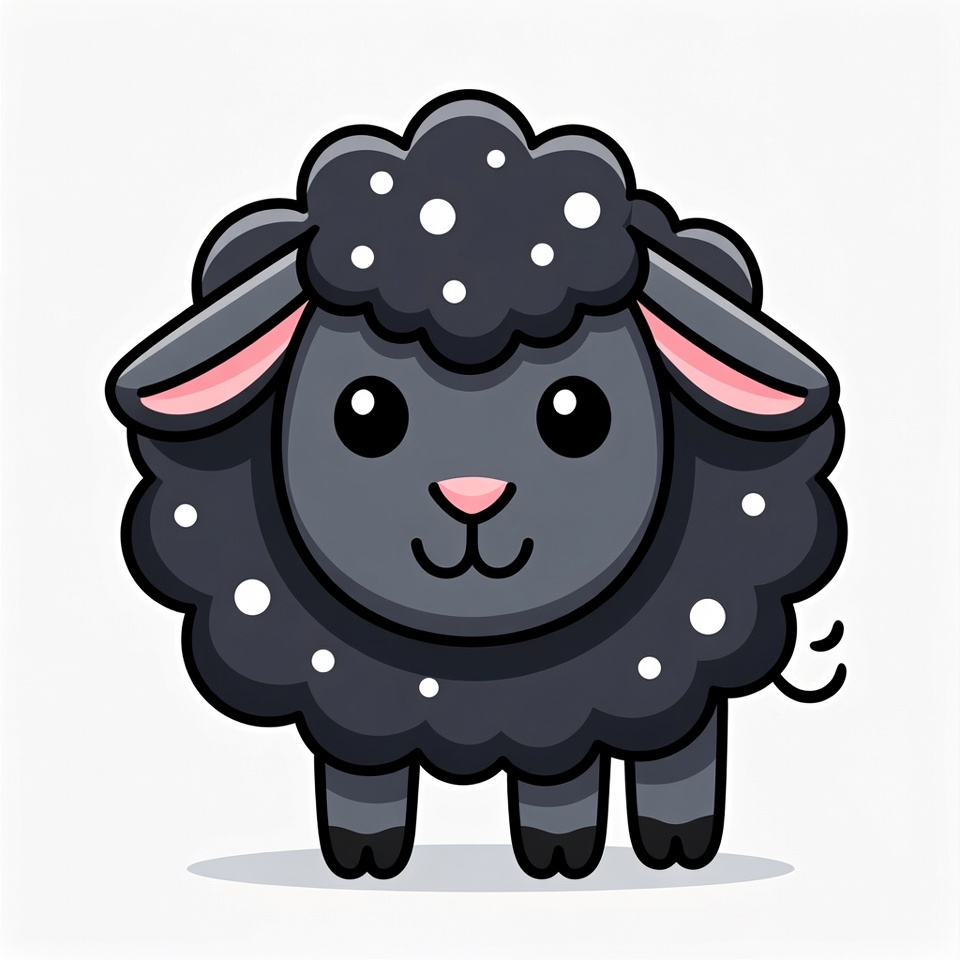 A cartoon black sheep with fluffy wool dotted with white spots stands on a white background. It has large expressive eyes, pink ears and nose, and a small smiling mouth. The illustration features a curly tail and simple line art style.