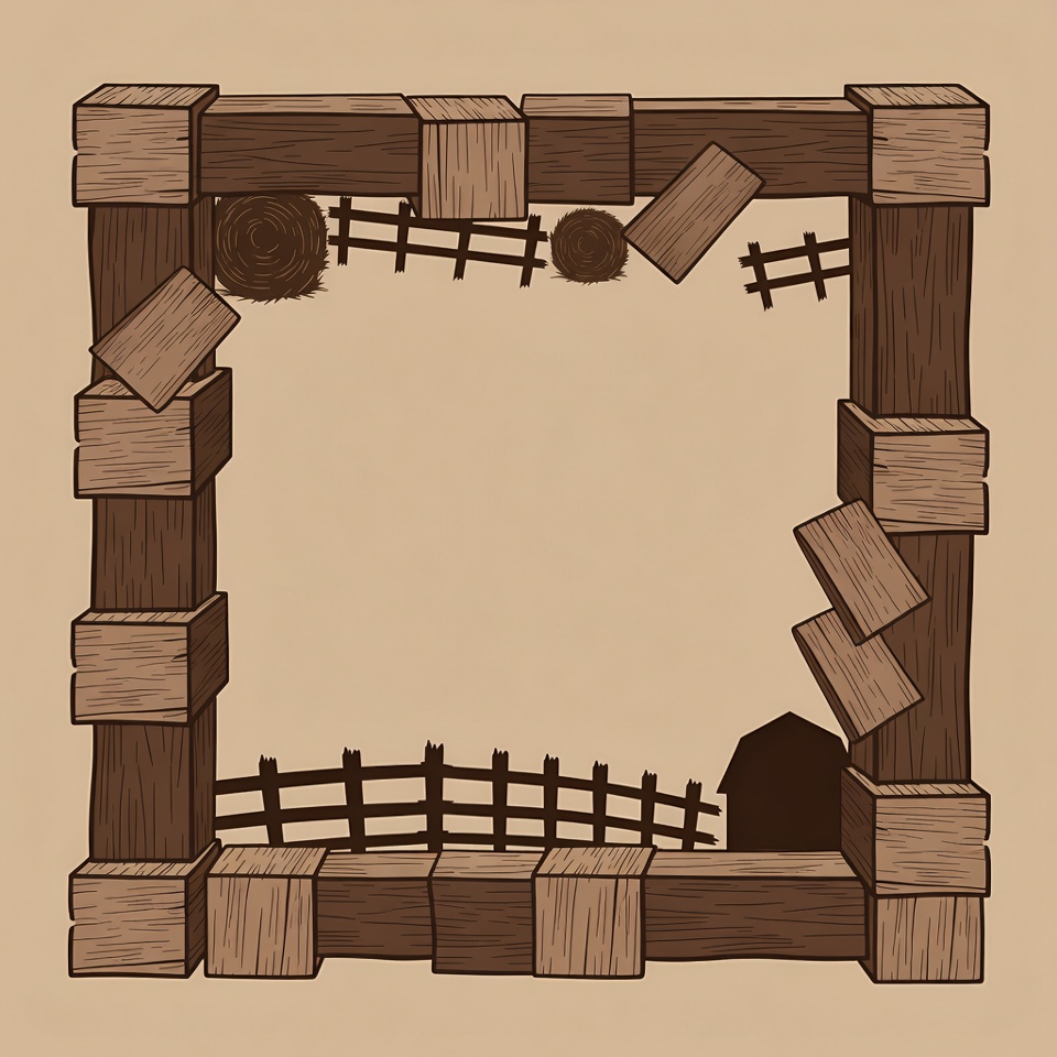 A clipart illustration features a rectangular wooden frame made of stacked logs and planks. It includes a picket fence at the bottom, scattered hay bales, and a small barn silhouette inside. The central area is empty against a light beige background.