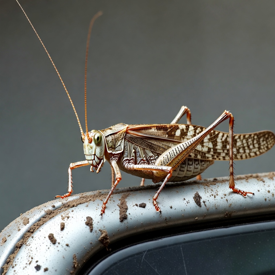 A large grasshopper with long antennae and spotted wings perches on the edge of a silver car. Its body features brown and green hues with intricate wing patterns. The insect stands on a slightly dirty metal surface against a gray background.