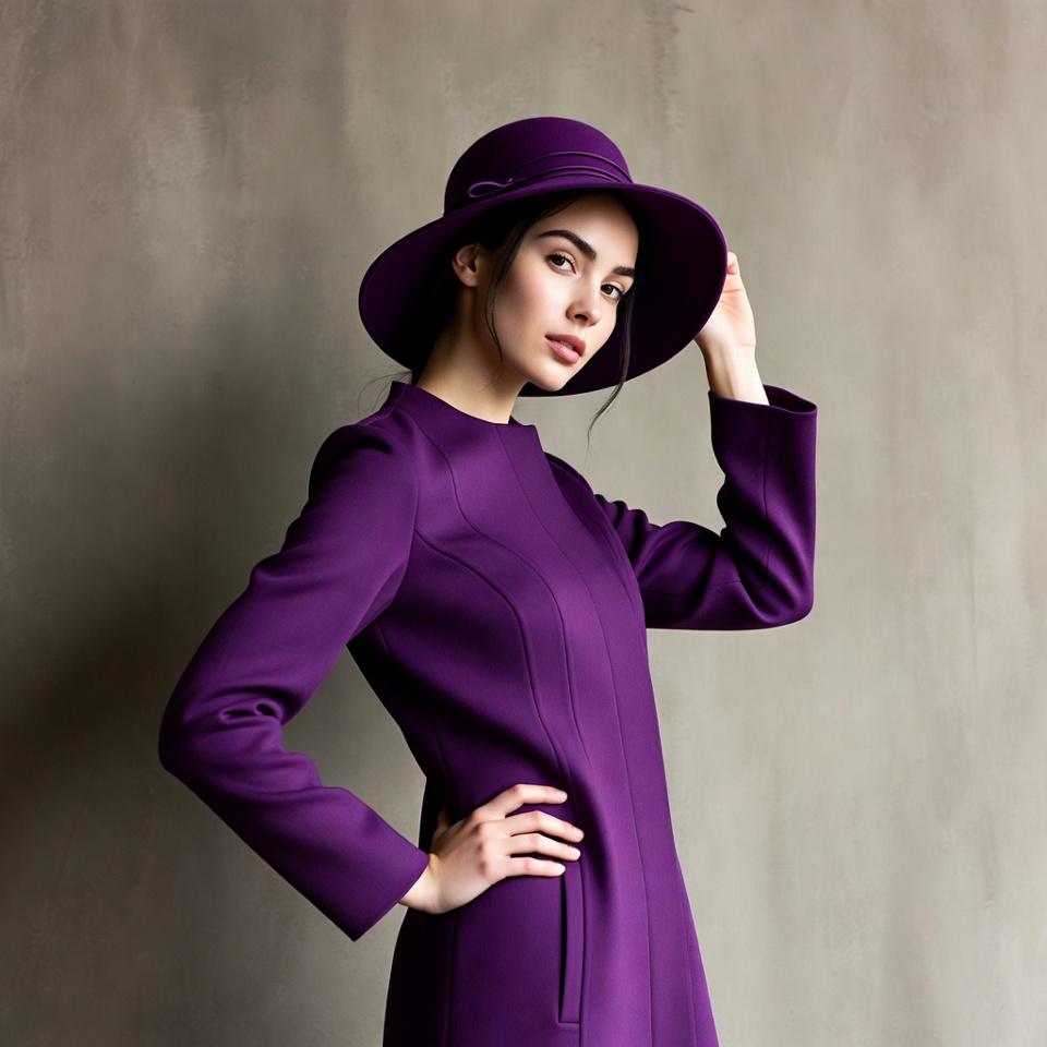 A young woman with long dark hair poses confidently against a beige wall. She wears a stylish purple cloche hat with a bow and a matching long purple coat with a structured design. She holds the hat with one hand while resting the other on her hip.