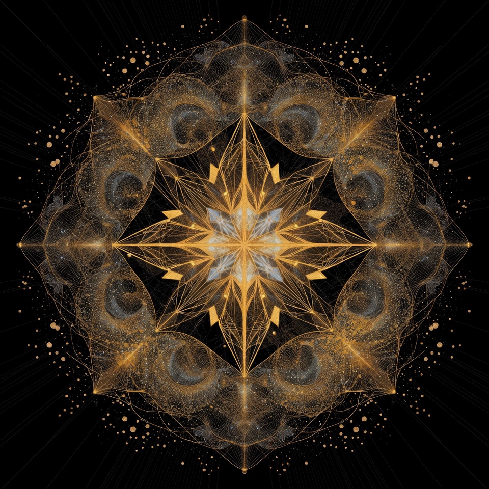 abstract art, black background, cosmic pattern, decorative art, digital illustration, fractal art, geometric pattern, glowing gold, gold design, golden mandala, intricate lines, mystical design, ornate pattern, radial symmetry, sacred geometry, sparkling particles, star shape, symmetrical design, wireframe mandala, mandala