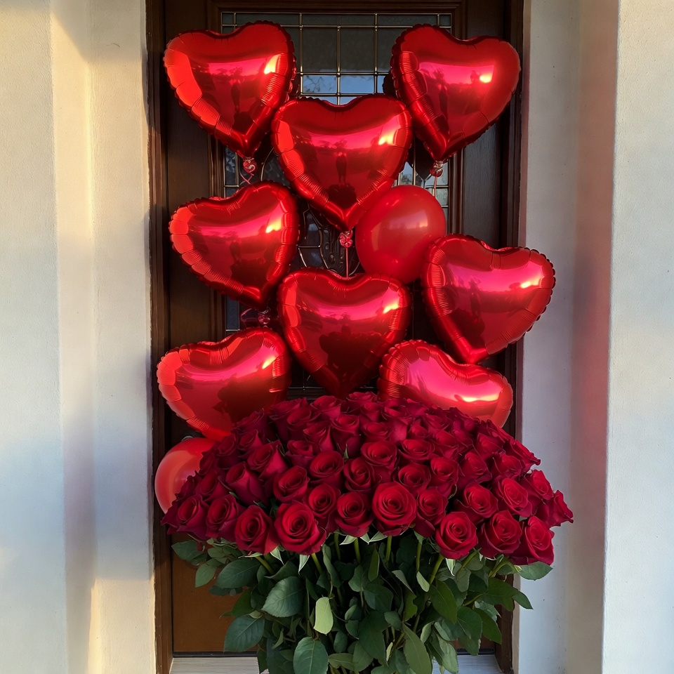 A large bouquet of red roses sits in front of a wooden door with glass panels. Shiny red heart-shaped foil balloons are clustered above the roses. The arrangement is placed on a light-colored porch.