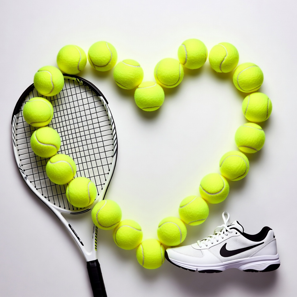 Yellow tennis balls form a large heart shape on a white background. A black tennis racket is positioned diagonally across the heart. A white Nike tennis shoe sits nearby.