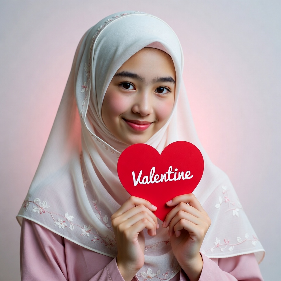 A young Asian woman wearing a white hijab and pink outfit holds a large red heart-shaped sign that reads 'Valentine'. She smiles happily at the camera against a soft pink background. Her hijab has delicate lace edges, and she grips the sign with both hands.