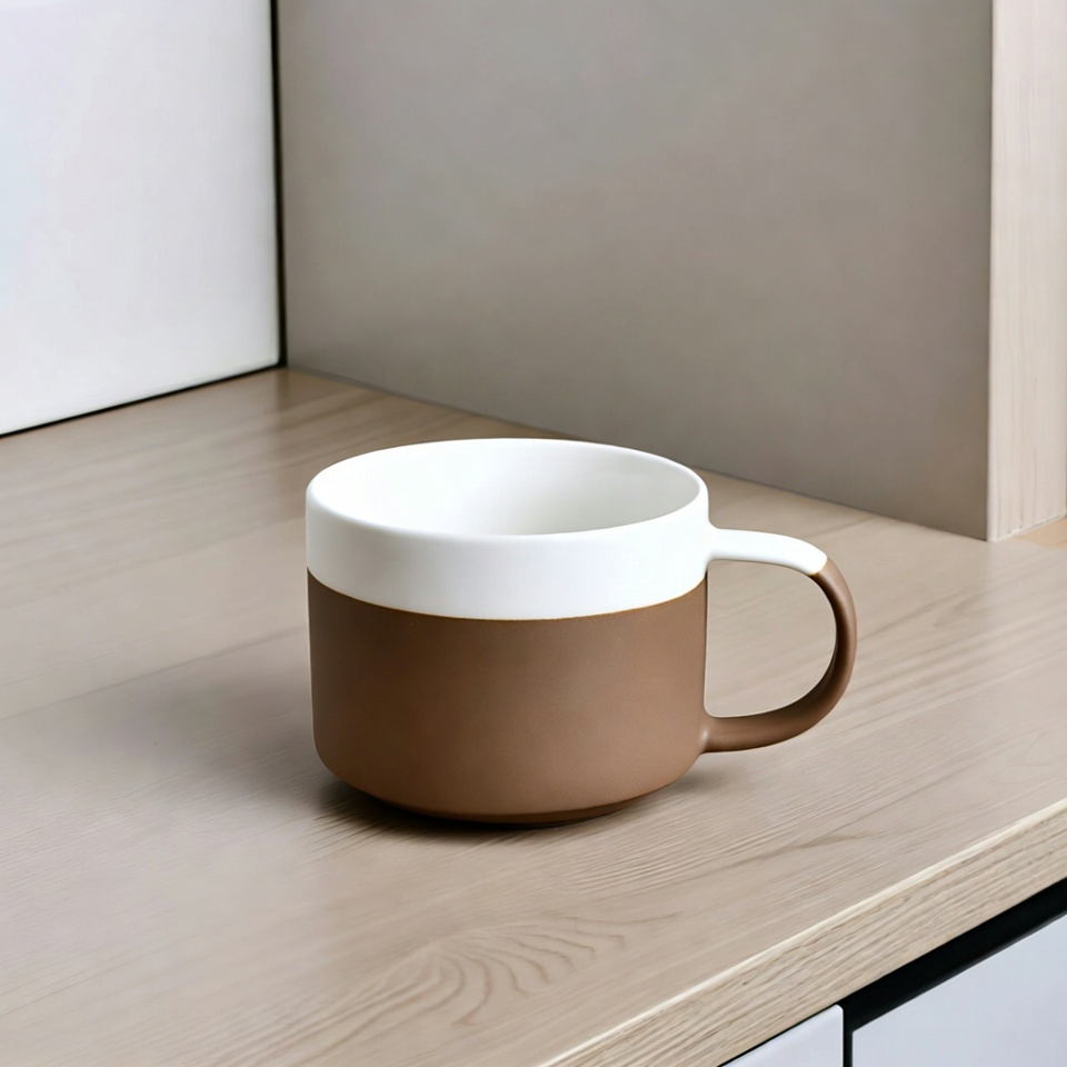 brown mug, ceramic mug, coffee mug, cup, drinkware, handle, isolated background, kitchen mug, matte finish, minimalist, modern mug, two-tone mug, white mug, wooden surface, mug