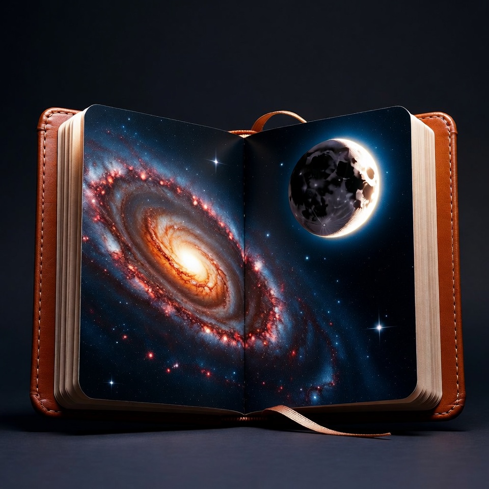 A brown leather book lies open on a dark surface, displaying a vibrant spiral galaxy with orange and red hues on the left page. The right page features a detailed crescent moon against a starry black space background. The cosmic scene emerges vividly from the pages, illuminated with glowing stars.