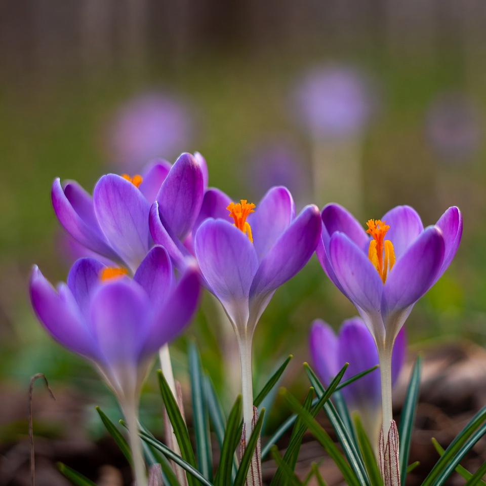 blooming flowers, bokeh, crocus flowers, floral, flower cluster, forest background, fresh blooms, garden, green grass, macro photography, nature, orange centers, outdoor, petals, purple flowers, spring flowers, stems, violet crocuses, wildflowers, crocuses