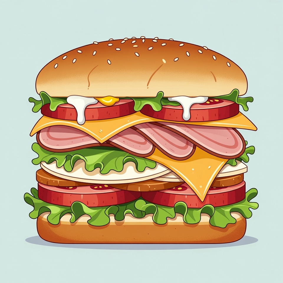 beef patty, burger, cartoon, cheese, clipart, colorful, drawing, fast food, food, fresh ingredients, ham, hamburger, illustration, isolated background, juicy burger, lettuce, meat layers, sandwich, sauce, sesame bun, stacked, tomato, vector, veggie toppings, cheeseburger