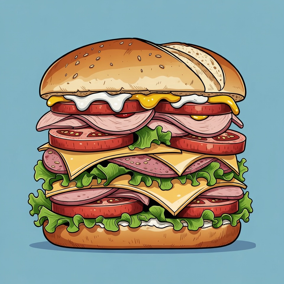 A colorful hand-drawn illustration of a tall burger on a blue background. It features sesame seed buns, layers of ham, salami, cheese, lettuce, and tomato slices. The burger is depicted in a cartoon style with bold outlines and vibrant colors.