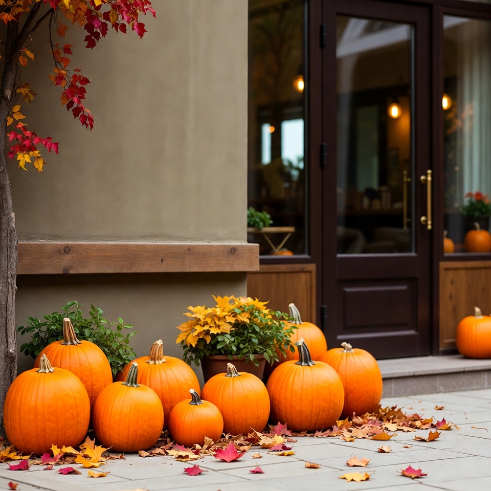 Several orange pumpkins in various sizes are arranged on the ground in front of a modern cafe entrance with large glass doors. Red and orange autumn leaves scatter around the pumpkins, with a small tree featuring fall foliage nearby. Potted plants and warm interior lights enhance the seasonal outdoor display.