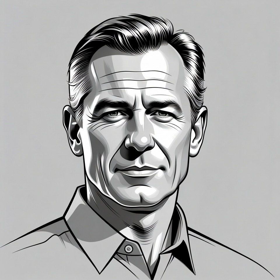 A digital grayscale illustration of a mature man with neatly combed graying hair and a serious expression. He wears a collared shirt and faces forward against a plain gray background. The artwork features bold line work and shading for a realistic effect.
