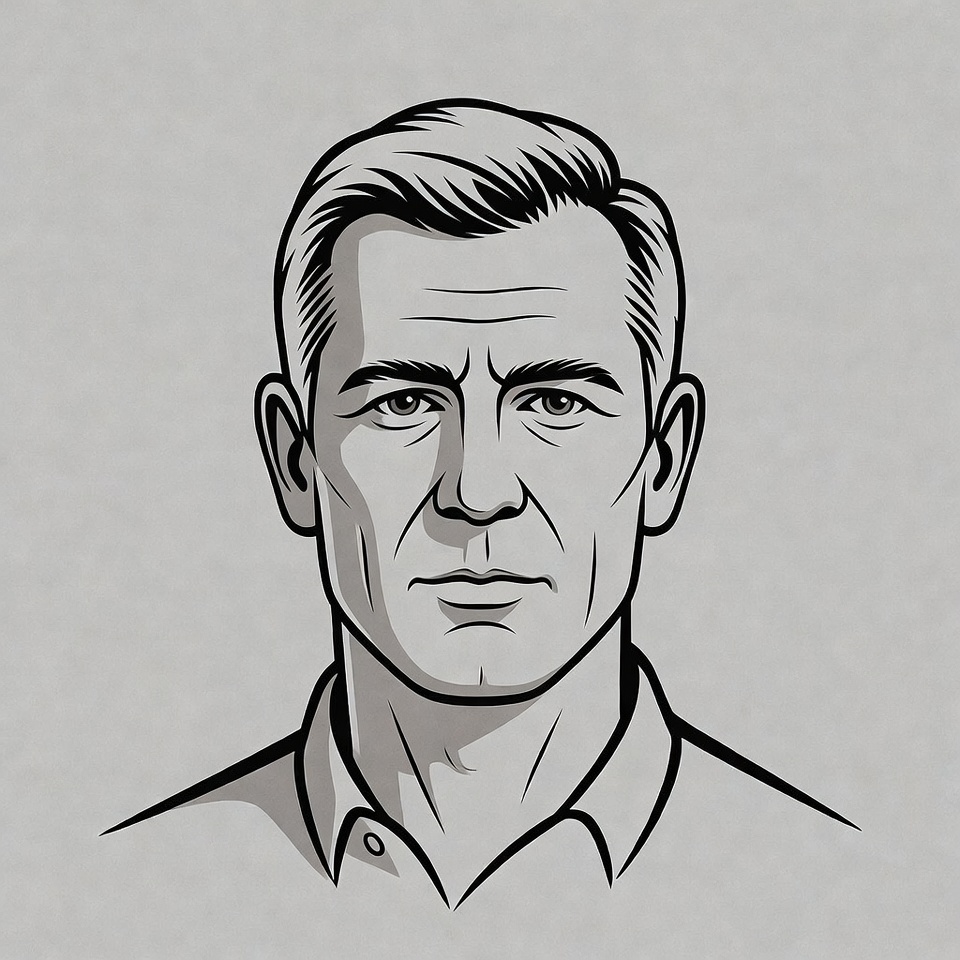 Black and white line art illustration of a middle-aged man with short combed hair and a serious expression. He wears a collared shirt with the top button undone. The portrait is centered on a plain gray background.