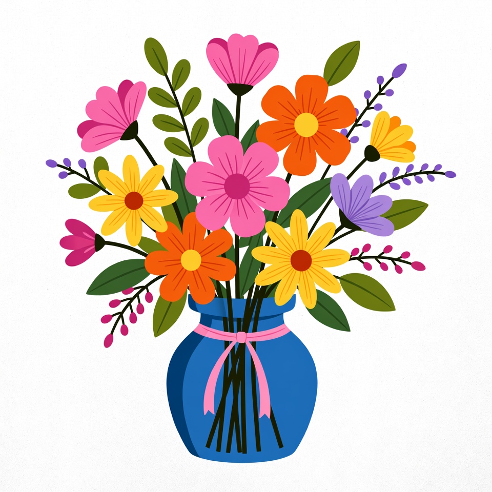 A vibrant bouquet of flowers in pink, orange, yellow, and purple hues is arranged in a blue vase with a pink ribbon. The illustration features detailed petals, green leaves, and stems. It is presented on an isolated white background.