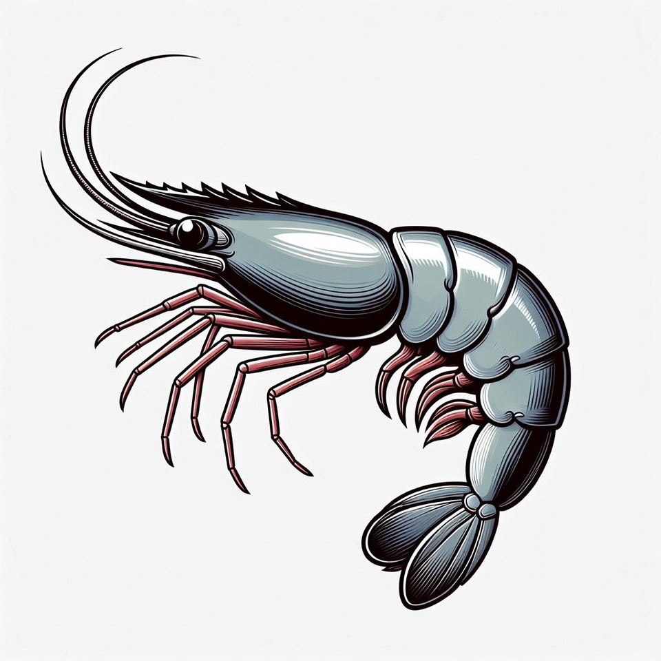 claws, clipart, curved body, detailed, gray shrimp, illustration, isolated background, legs, long antennae, marine animal, prawn, red accents, seafood, vector art, white background, shrimp