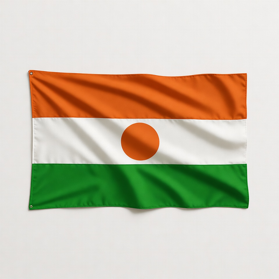 A vibrant flag of Niger waves against a white background. It features three horizontal stripes of orange, white, and green, with an orange circle centered on the white stripe. The fabric shows realistic folds and texture.