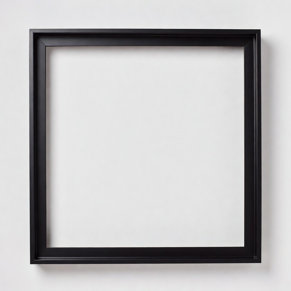 A sleek black picture frame hangs on a plain white wall. The frame is square with a thin border and contains no artwork or image inside. It is centered and isolated against the solid background.