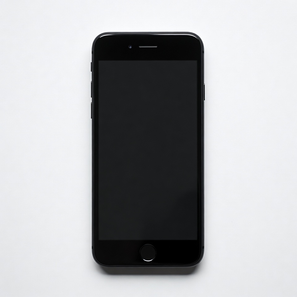 A black iPhone smartphone with a blank black screen is placed flat on a plain white background. The device features a home button at the bottom and is viewed from above. It appears sleek and isolated with no other objects visible.