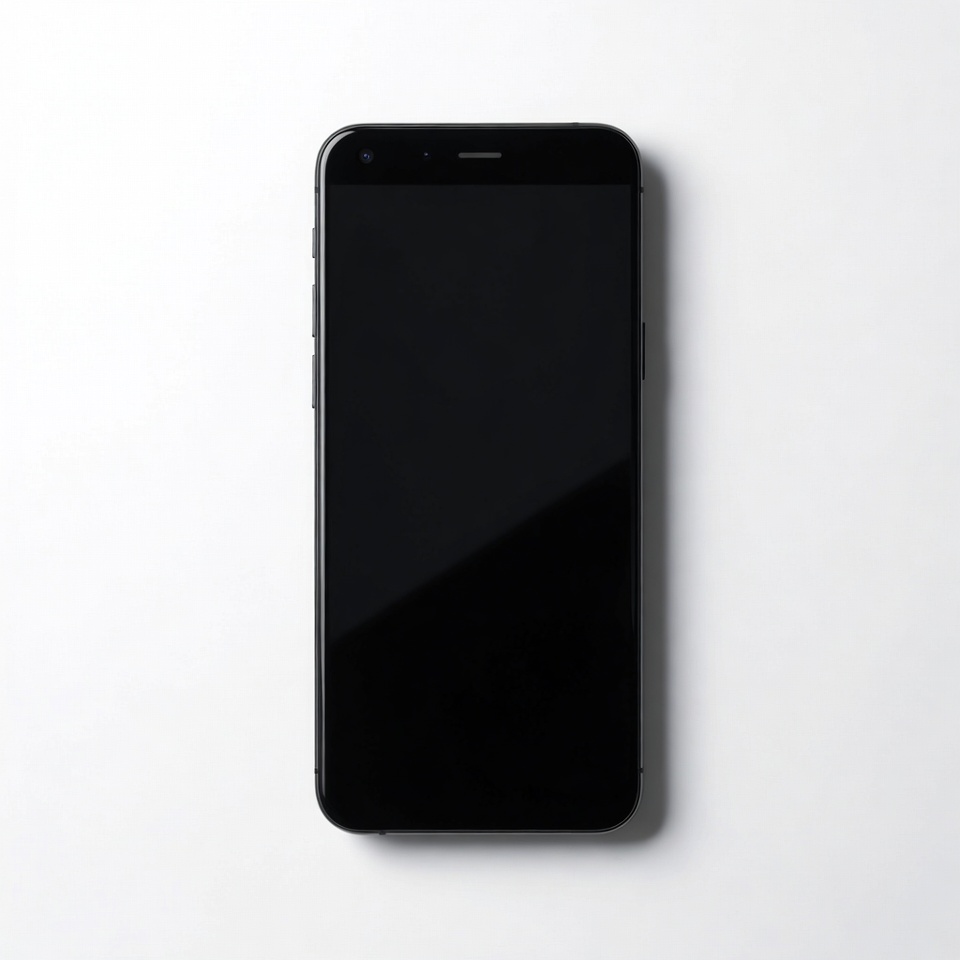 A sleek black iPhone with a dark screen is placed upright on a plain white background. The phone's edges and camera are clearly visible. It is centered and isolated for a clean product view.