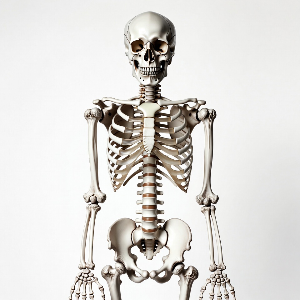 3D render, Halloween, anatomy, arms, bone structure, bones, front view, full body, human skeleton, isolated, legs, medical, realistic, ribs, skull, spine, standing, white background, skeleton