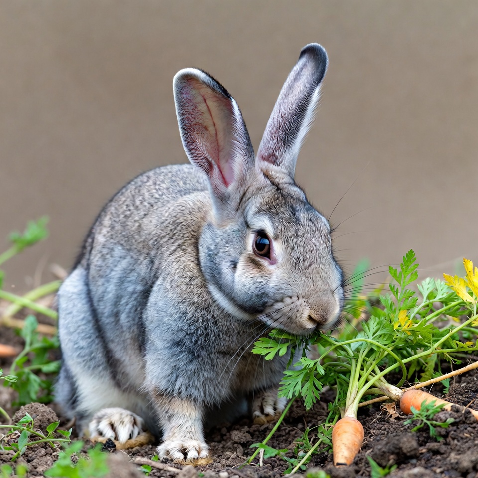 Gray bunny eating carrot
