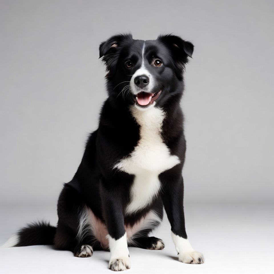 A black and white Border Collie dog sits on a plain gray background. The dog has a fluffy coat with distinctive white markings on its chest, paws, and face. It looks directly at the camera with a happy expression, tongue out and mouth open.