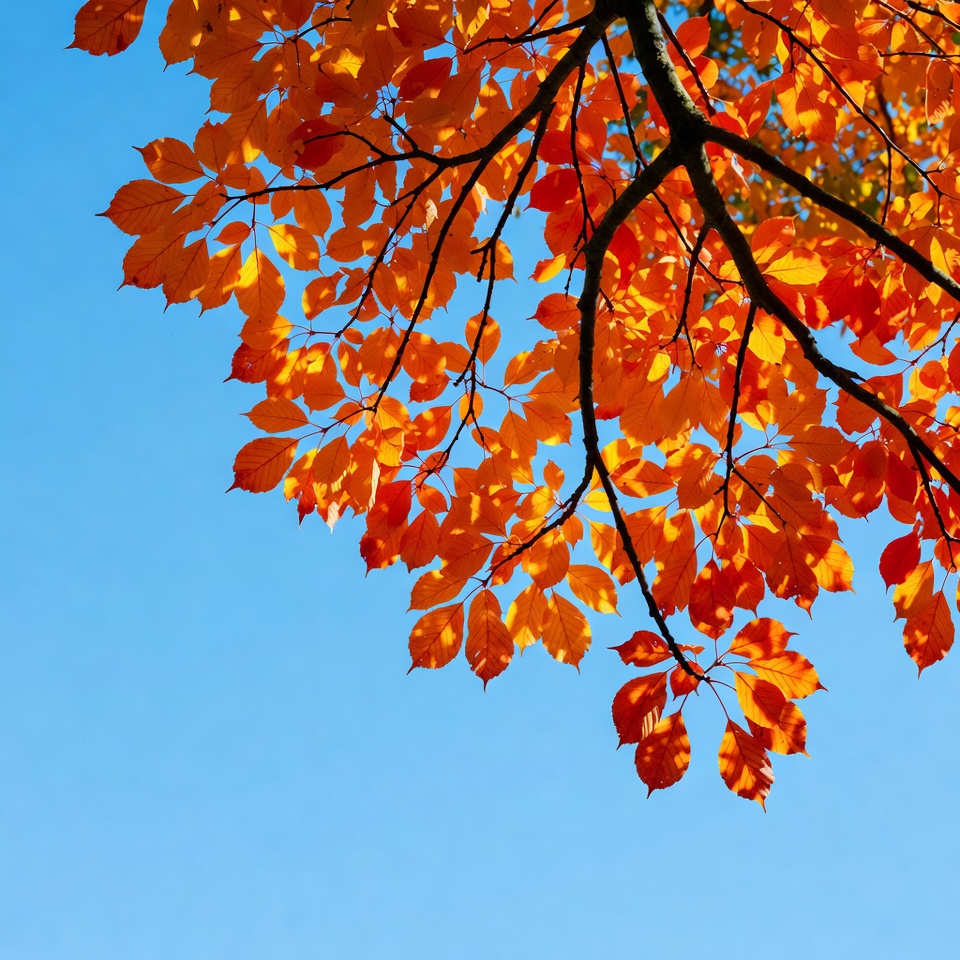 autumn foliage, blue sky, deciduous tree, fall colors, fall leaves, leaf colors, nature, orange leaves, outdoors, red leaves, seasonal, sky background, tree branches, vibrant leaves, autumn tree