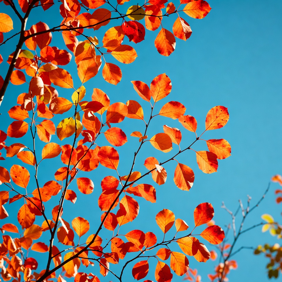 autumn, blue sky, branches, fall, fall foliage, foliage, leaves, nature, orange leaves, outdoors, red leaves, sky, tree branches, vibrant colors, autumn leaves