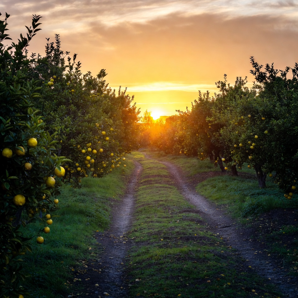 agriculture, branches, citrus trees, clouds, dirt path, evening light, farm path, foliage, fruit, golden hour, green grass, orange fruit, orange trees, orchard path, pathway, ripe oranges, rural landscape, sky, sunny sunset, sunset, tree rows, trees, warm light, orange orchard