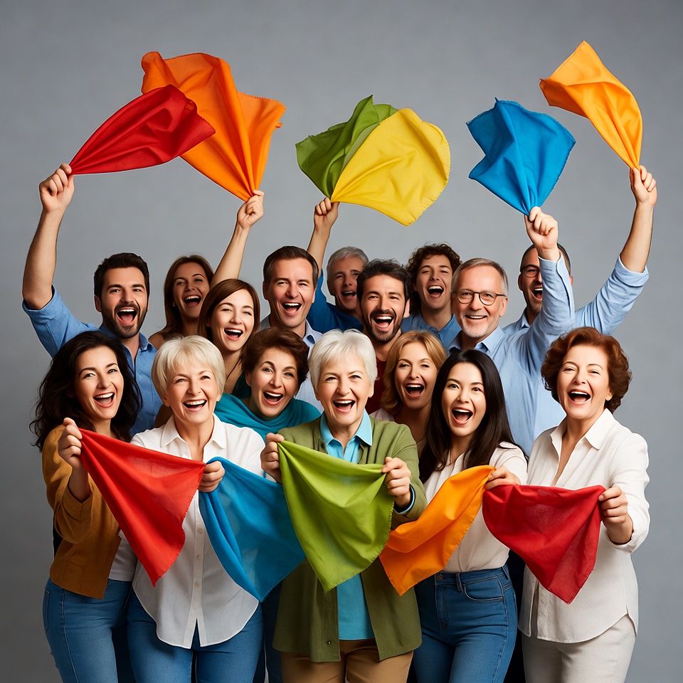 A large diverse group of men and women of various ages stands together against a gray background, joyfully holding up vibrant colored fabric sheets in red, orange, yellow, green, and blue. They are dressed in casual shirts and pants, with many smiling and raising their arms high. The fabrics drape dynamically from their hands, creating a festive display.