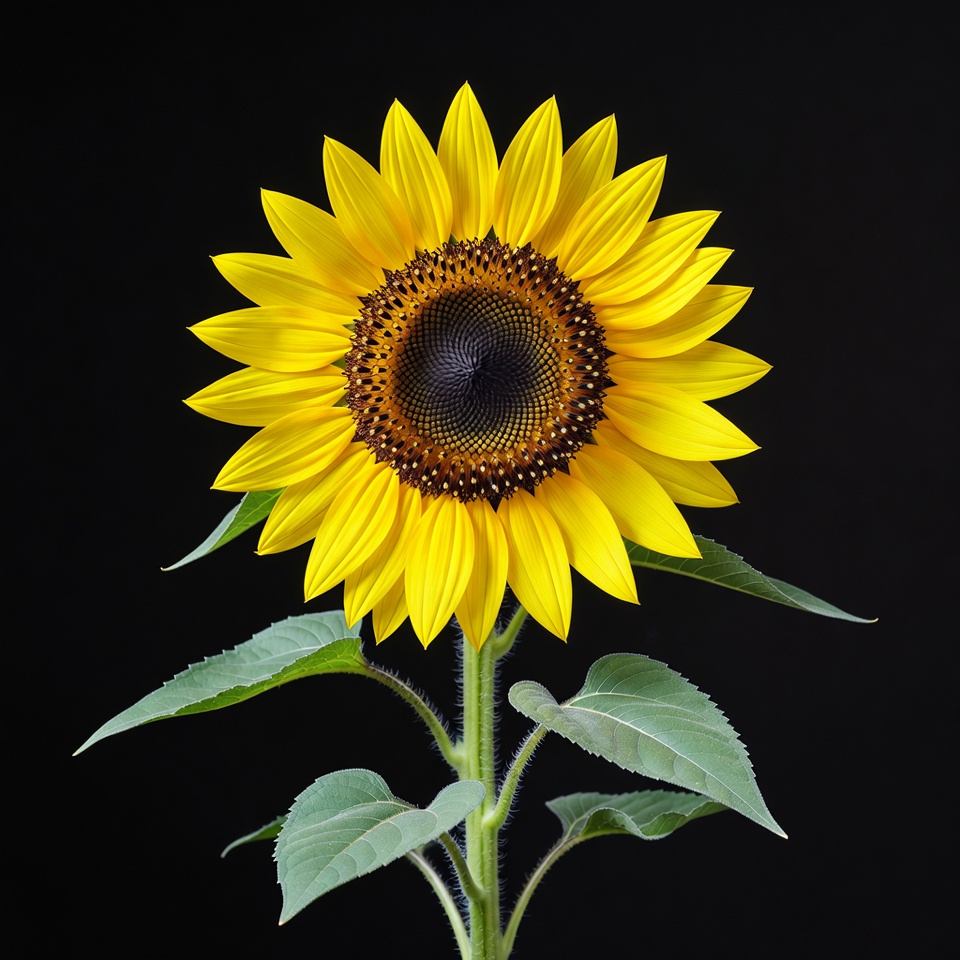 black background, bloom, botany, closeup, floral, flower, green leaves, isolated, nature, petals, plant, stem, vibrant, yellow flower, sunflower